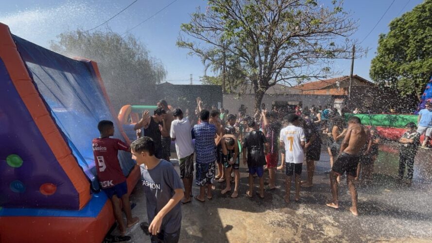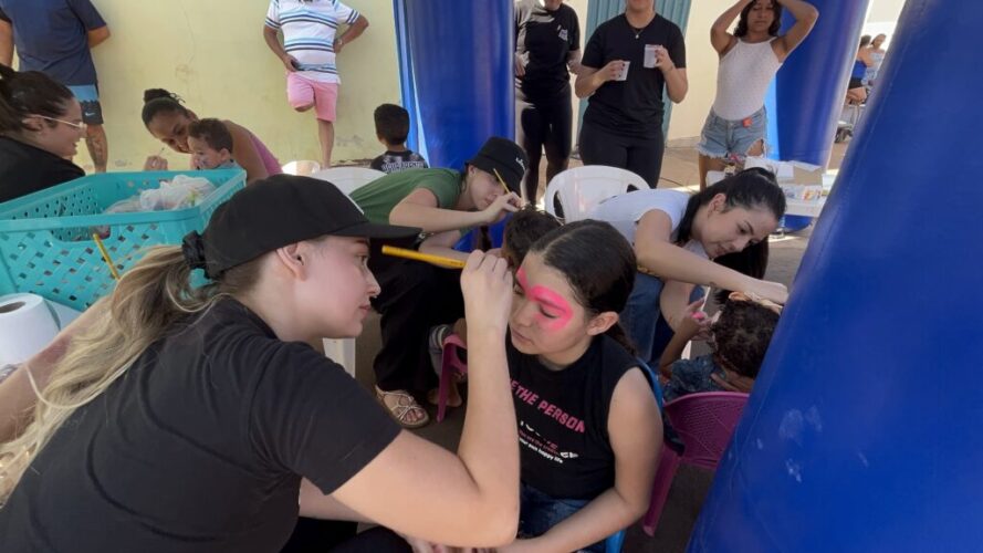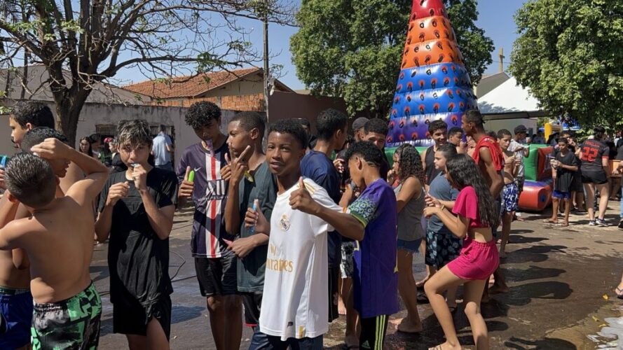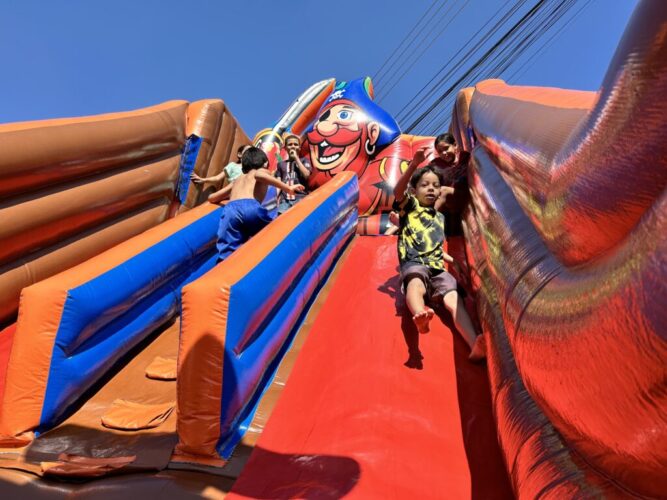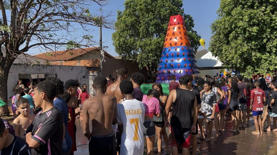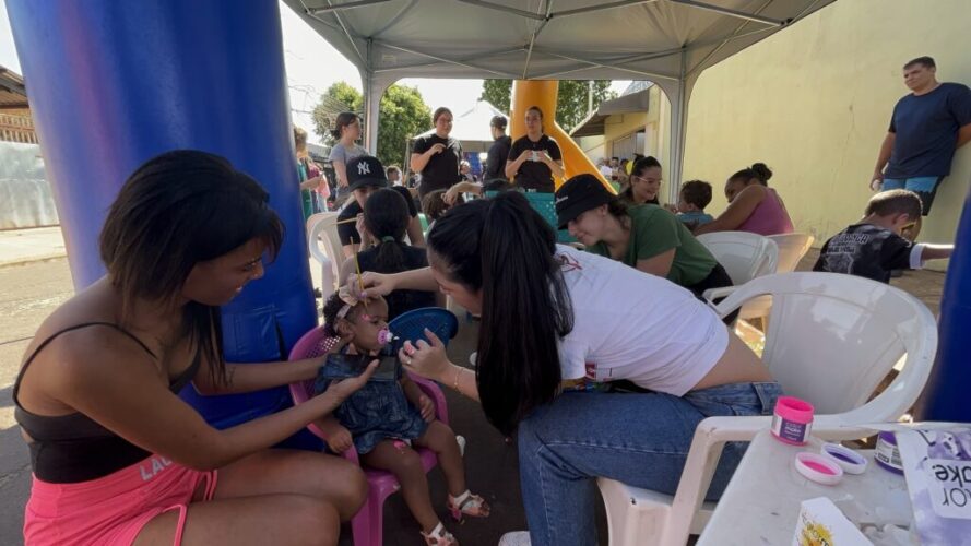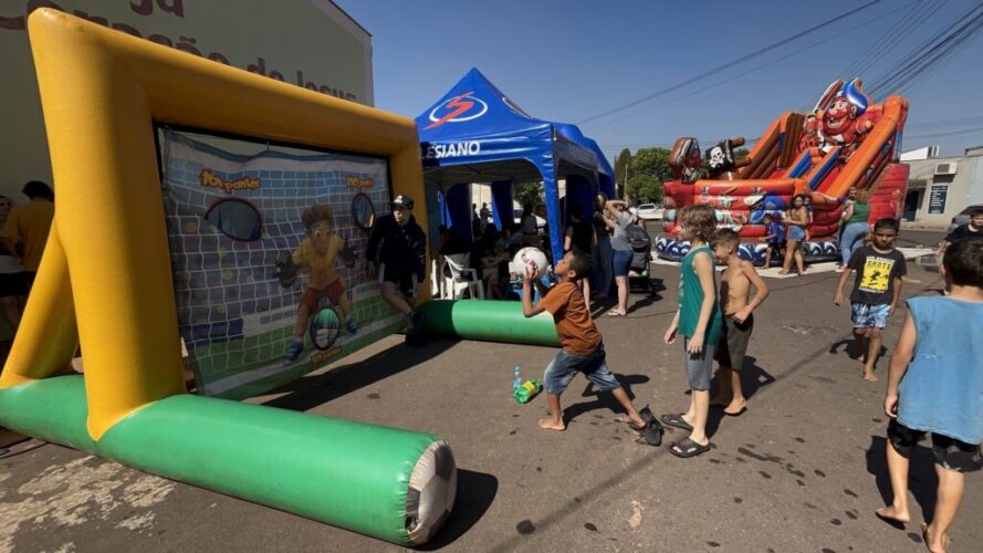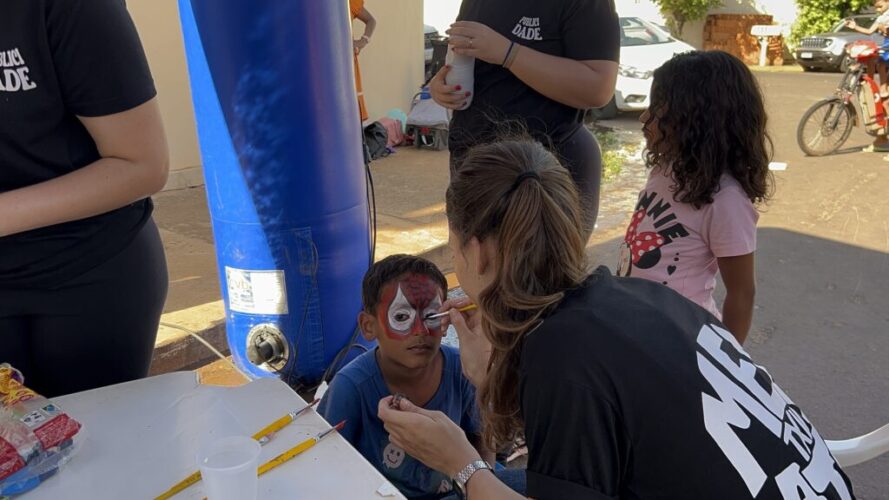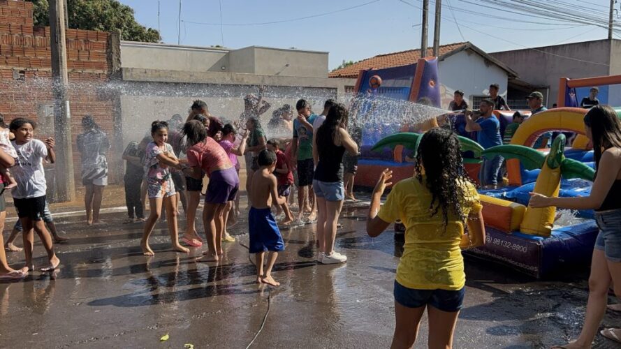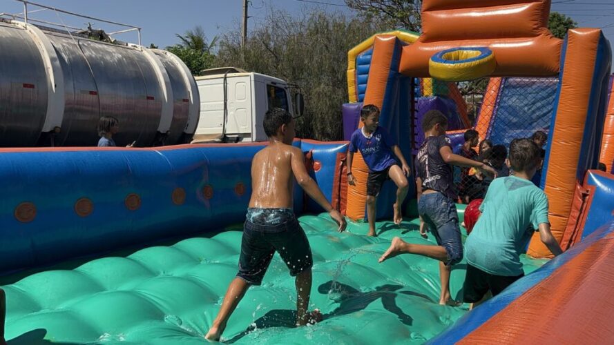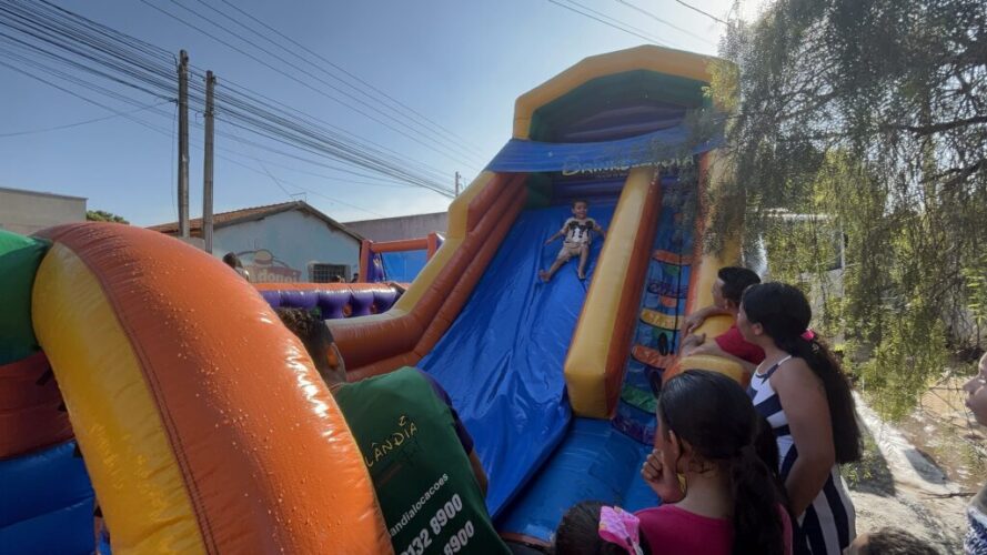 A programação incluiu brinquedos infláveis, distribuição de cachorro-quente, refrigerantes, gelinhos, saquinhos de doces e pintura facial, garantindo momentos de alegria para todos os participantes.