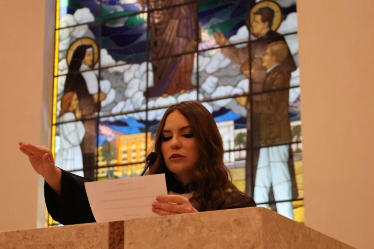 Após a cerimônia religiosa, presidida pelo Pe. Paulo, os presentes acompanharam a execução do Hino Nacional, seguida do Juramento, lido pela formanda, Raíssa Galo.