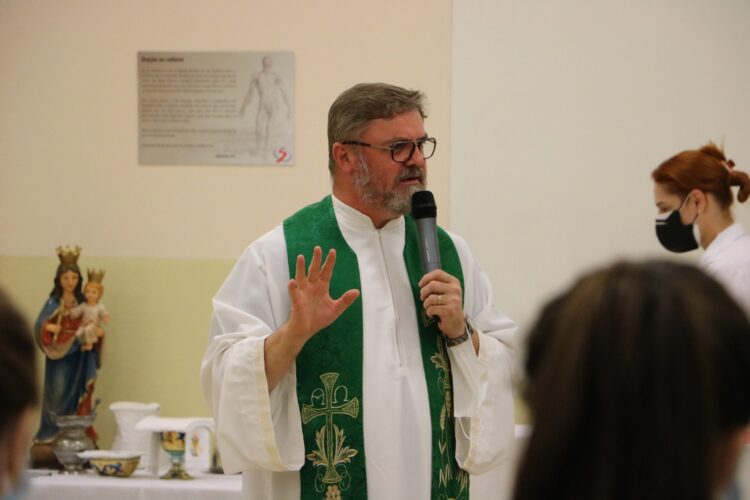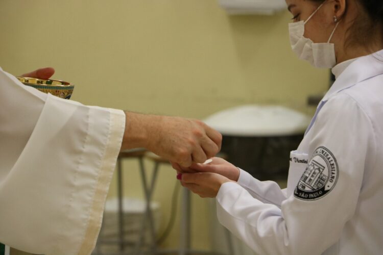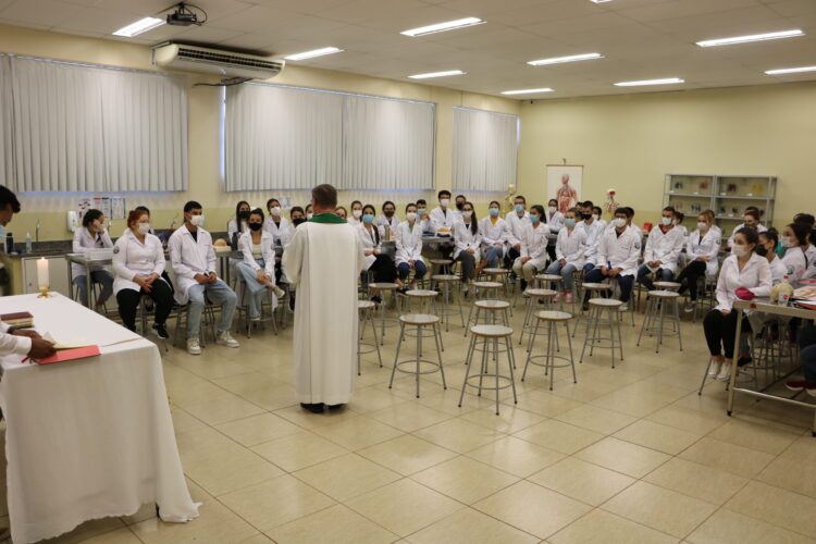 A cerimônia foi conduzida pelo Pró-Reitor de Pastoral, Pe. Paulo Jácomo, no Laboratório de Anatomia Humana, na tarde do dia 21 de fevereiro. “A celebração da Eucaristia é um gesto de ação de graças. Então, agradecemos aqui, a Deus, pelo dom da vida”, disse Pe. Paulo.