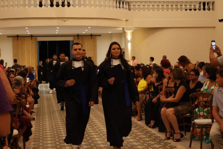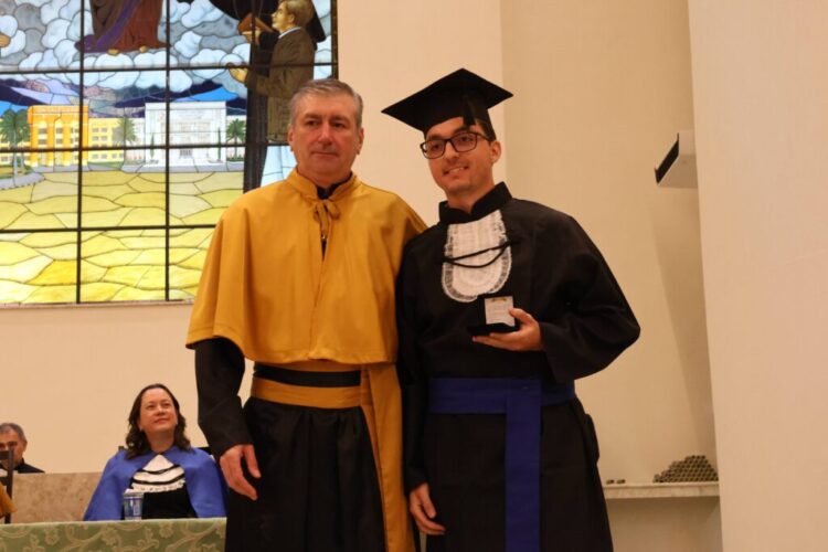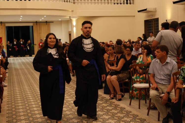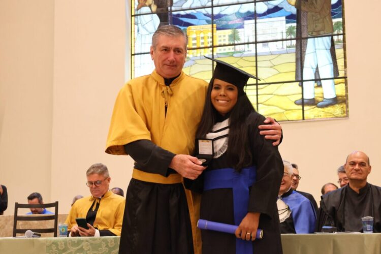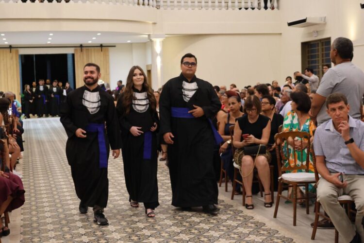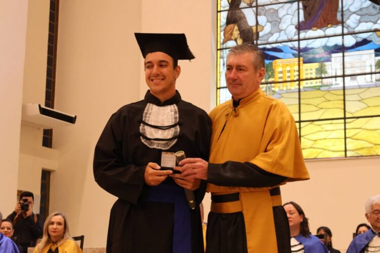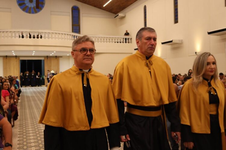 Após a celebração religiosa, presidida pelo Pe. Paulo, os presentes assistiram à execução do Hino Nacional, seguido do Juramento, proferido pela formanda, Natália Teodoro Fagundes. A cerimônia prosseguiu com a imposição do capelo e a entrega dos diplomas aos formandos, realizadas pelos membros da Reitoria, paraninfos e patronos. O bacharel em Direito, Robinson Douglas Tardivo de Morais, foi escolhido para proferir o discurso como orador das turmas, enquanto o professor Rafael Silva Cipriano assumiu o papel de paraninfo.